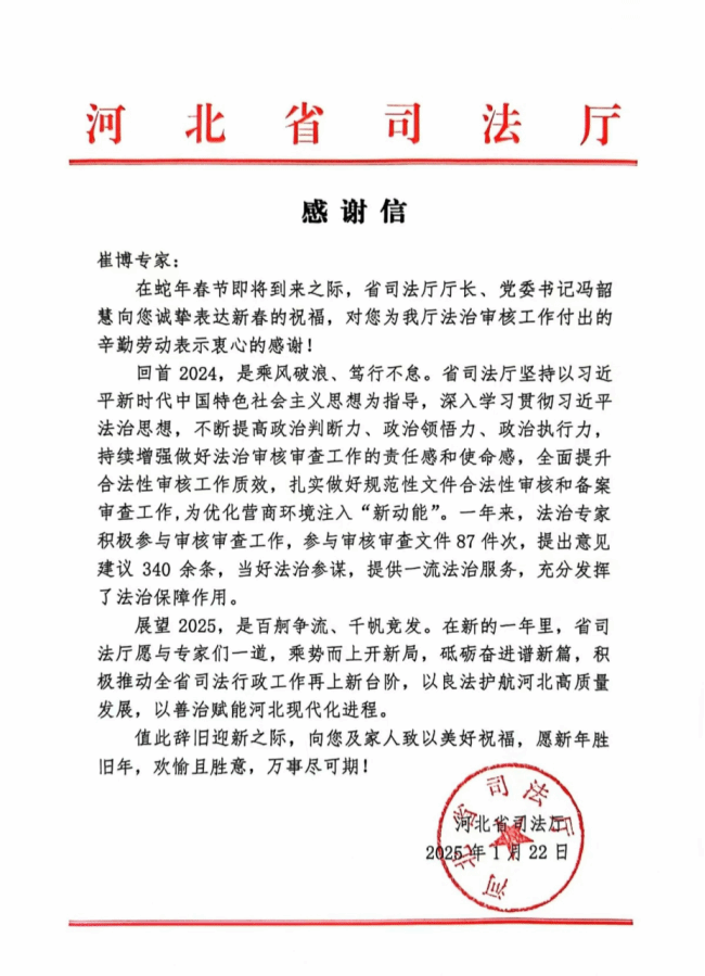 河北省司法厅向我校马克思主义学院崔博老师寄发感谢信