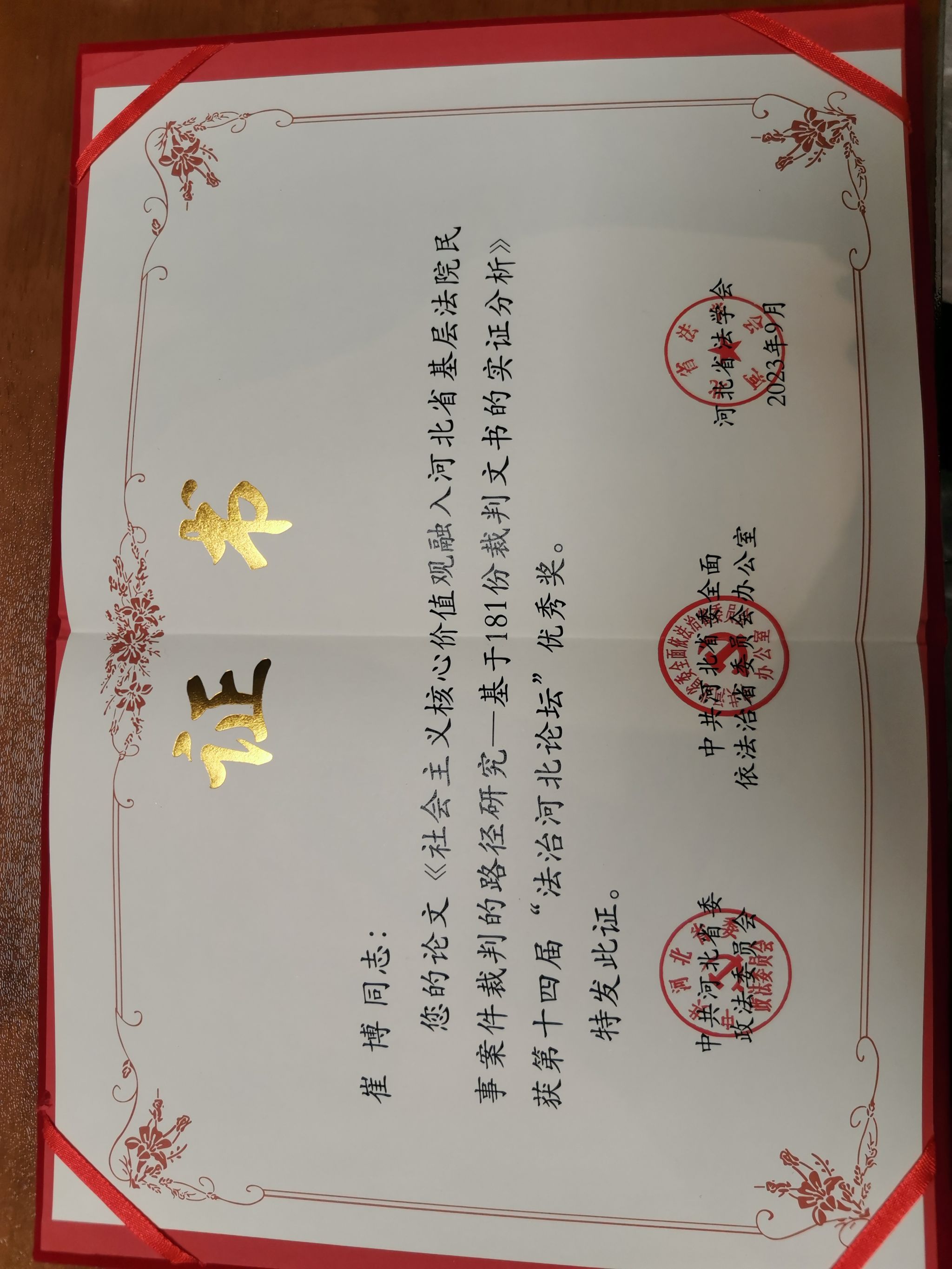 本届论坛共收到全国各地论文投稿306篇,会议现场对优秀论文获奖者进行通报表彰并颁发证书。崔博副教授所撰写的文章《社会主义核心价值观融入河北省基层法院民事案件裁判的路径研究——基于181份裁判文书的实证分析》,荣获第十四届“法治河北论坛”优秀奖。