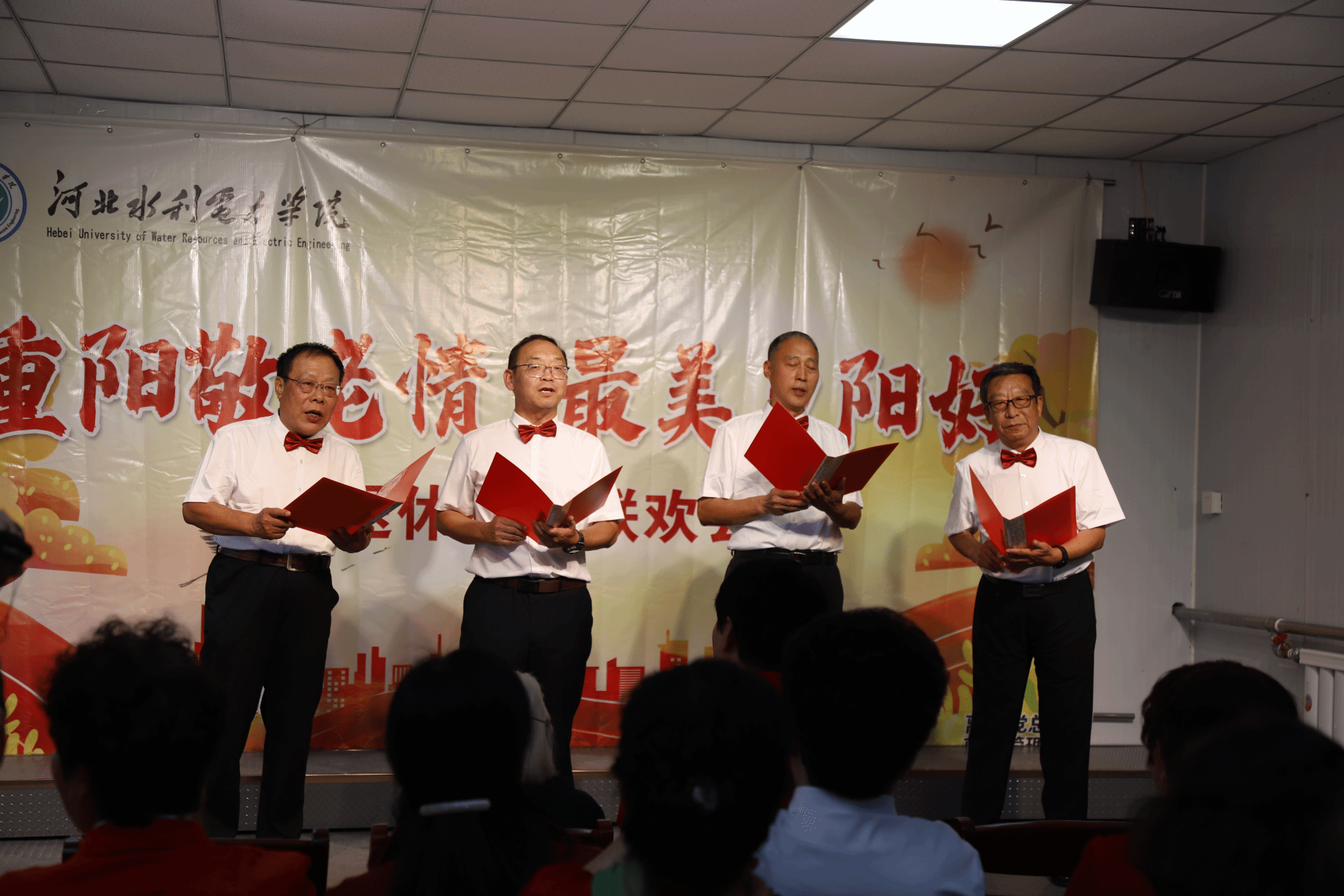联欢会现场气氛热烈,节目表演精彩纷呈:韩杏改老师带来的朗诵《九九重阳》,声音洪亮,情感饱满,让人们在优美的诗句中感受到了重阳节的浓厚氛围;石国香老师的舞蹈《三月桃花开》更是如春风拂面,轻盈的舞姿仿佛将大家带入了一个桃花盛开的美丽世界;刘国民、赵兰庚、王建平、李志勇四位老师的四重唱《啊,朋友再见》,用歌声诠释友谊与岁月的珍贵,赢得了大家阵阵掌声;最后,大家用三首大合唱《歌唱祖国》《我的祖国》《最美不过夕阳红》抒发对祖国的热爱与祝福、表达对美好生活的向往和对晚年生活的热爱,也为本次联欢会画上圆满的句号。