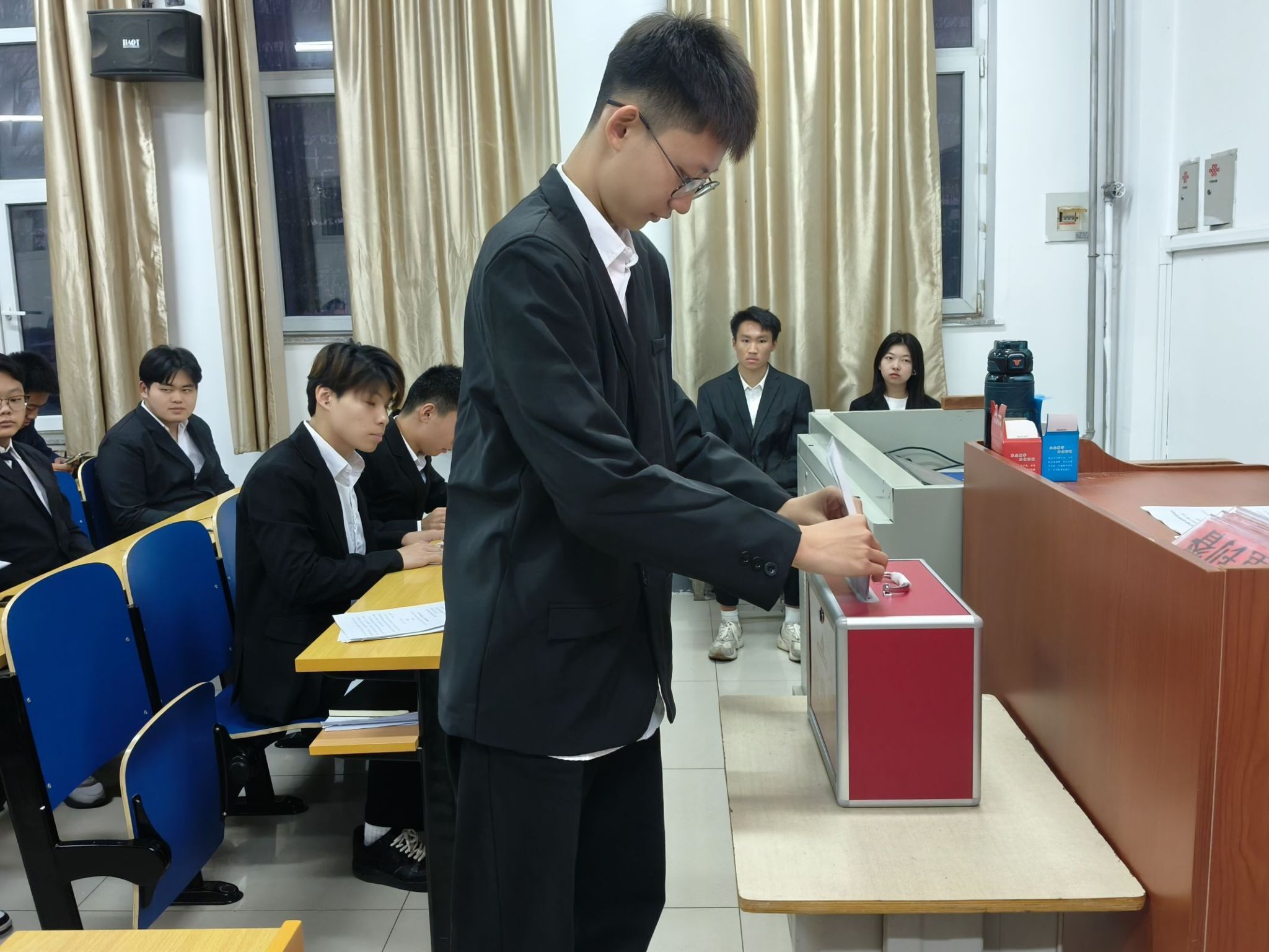 第二次全体代表大会中,杨铭轩同学宣读了大会选举办法(草案),全体代表审议并通过大会选举办法,通过监票人和计票人名单。大会工作人员介绍学生委员会委员候选人基本情况、学生会执行主席候选人基本情况。秉承公平、公正、民主的原则,学生代表进行投票。根据统计选票结果,大会主席团第二次会议听取选举结果的报告,通过当选名单。
