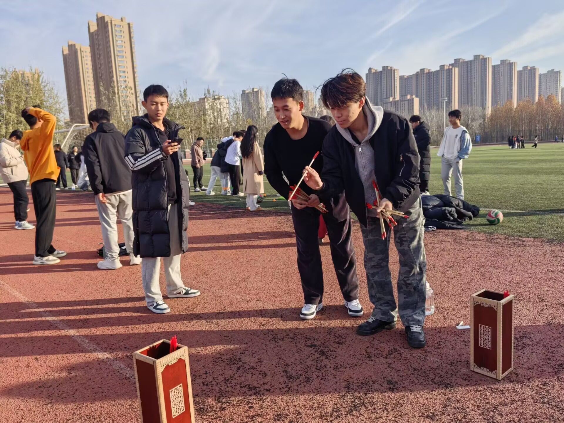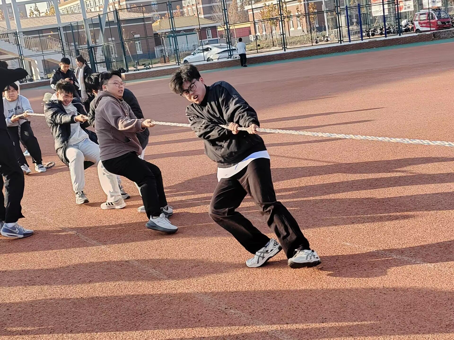 本次运动会包含拔河比赛、三人四足、背靠背运球、投壶和集体跳绳。活动现场充满着欢声笑语,趣味十足。在背靠背运球时,各队成员步伐齐整,维持着球的微妙平衡。在三人四足比赛过程中,有的队伍提前讨论技巧、积极彩排,有的队伍成员相互扶持、共创佳绩,同学们双脚紧紧相绑,共同迈步向前。拔河赛场上,队员们齐心协力,嘴里喊着整齐的口号,全力以赴。跳绳过程中队员们动作整齐协调,协调一致,每一次跳跃都精准无误。这份团队合作的精彩瞬间,赢得了在场观众的阵阵掌声!